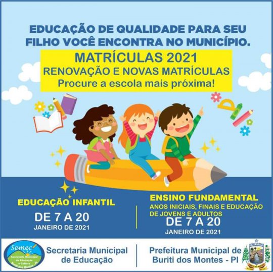 A Prefeitura Municipal de Buriti dos Montes divulgou na manhã desta quarta-feira (06) a abertura das matrículas na rede municipal de educação.