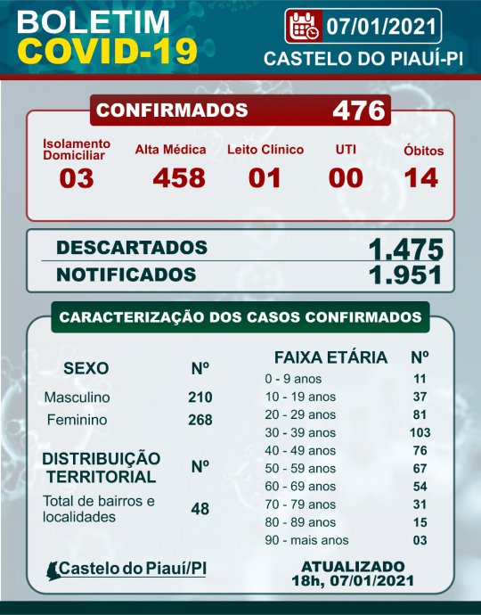 Castelo do Piauí, durante a Pandemia já registrou um total de 476 casos confirmados, sendo 03 ainda em isolamento domiciliar, 458 já em alta médica, 01 em leito clínico e 14 óbitos registrados.