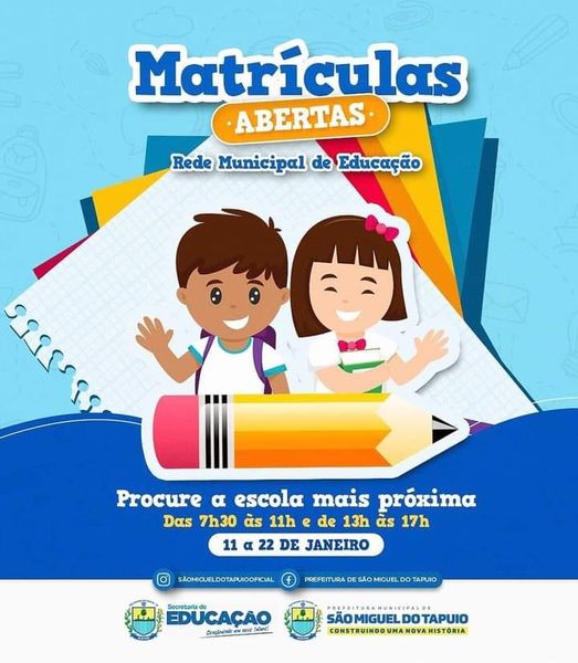 Seguindo todos os protocolos e orientações da OMS, a prefeitura de São Miguel do Tapuio/PI anunciou que as Matrículas para a Rede Municipal de Educação iniciam nesta segunda-feira (11), e vão até o dia 22 deste mês. Os horários de atendimento serão das 07h30 às 11h30 e das 13h às 17h. No ato da matrícula, os pais e /ou responsáveis devem levar os seguintes documentos: