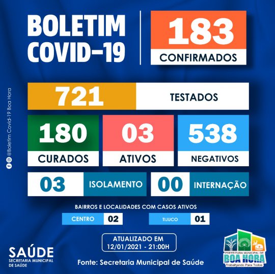 Segundo o boletim epidemiológico da Secretaria Municipal de Saúde De Boa Hora, divulgado na noite desta terça-feira (12), o município tem apenas 03 (três) casos ativos do infecção pelo novo coronavírus, vetor da Covid-19. O total de casos confirmados na cidade é 183, dos quais 180 já foram curados.