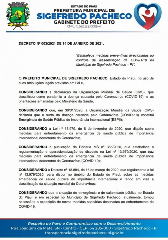 Além de Sigefredo, os municípios de Campo Maior e Picos adotaram a mesma medida, afim de evitar maior propagação do vírus visto que se aproxima as festividades de Carnaval.