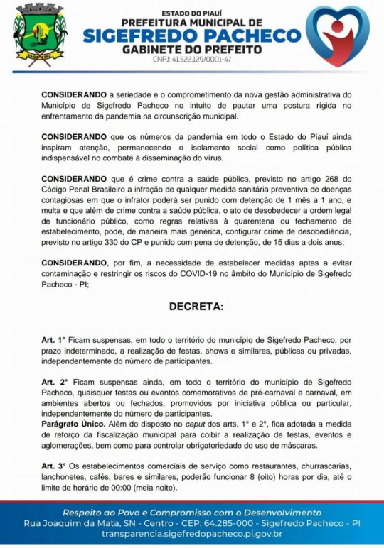 O prefeito de Sigefredo Pacheco/PI, Murilo Bandeira, assinou decreto nesta quinta-feira (14), determinando a suspensão de festas e shows de pré-carnaval e carnaval, no município, por tempo indeterminado. A decisão foi tomada para evitar a propagação da covid-19.