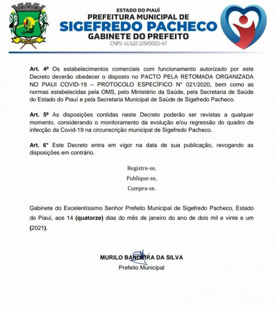 As medidas incluem festa públicas ou privadas no município, em ambientes abertos ou fechados, independe da quantidade de pessoas participantes desses eventos. O decreto leva em consideração, os números da pandemia em todo o estado do Piauí, e em Sigefredo, verificado o aumento no número de casos de infecção da covid-19, fazendo-se necessário a permanência de cuidados para se evitar aglomerações.