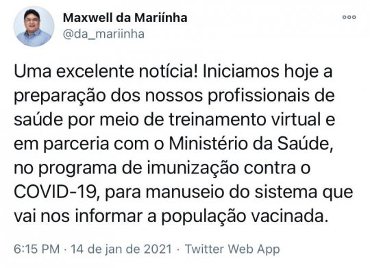 “Iniciamos hoje a preparação dos nossos profissionais de saúde por meio de treinamento virtual e em parceria com o Ministério da Saúde, no programa de imunização contra o COVID-19 para manuseio do sistema que vai nos informar a população vacinada”, postou o Prefeito.