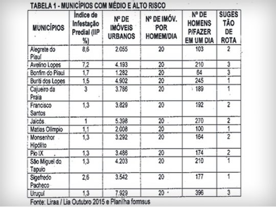 Todos os órgãos governamentais foram incluídos e terão envolvimento nas ações estipuladas no plano de contingência, entre eles o Exército, instituições de ensino superior, Detran, Corpo de Bombeiros e diversas secretarias de estado.Uma relação de municípios com médio e alto risco de infestação das doenças foi anexada ao plano. As cidades de Alegrete do Piauí, Avelino Lopes, Bonfim do Piauí, Buriti dos Lopes e Cajueiro da Praia lideram o ranking dos municípios apontados pelas autoridades em saúde como de alto risco.