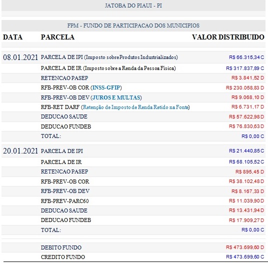 Segundo o Portal da Transparência, Jatobá do Piauí recebeu no mês de dezembro a importância de R$ 1.714.503,16 (um milhão, setecentos e quatorze mil, quinhentos e três reais e dezesseis centavos).