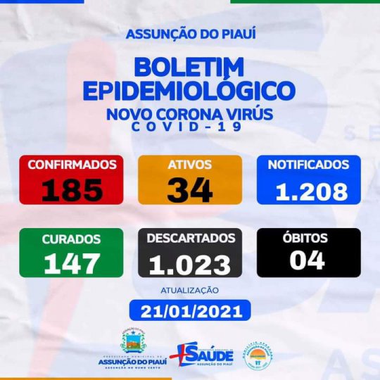 Já dee acordo com o boletim epidemiológico nesta quinta, 21, Assunção do Piauí já registrou 185 pessoas acometidas com o Vírus, sendo 147 curados, 34 ativos e 04 óbitos.