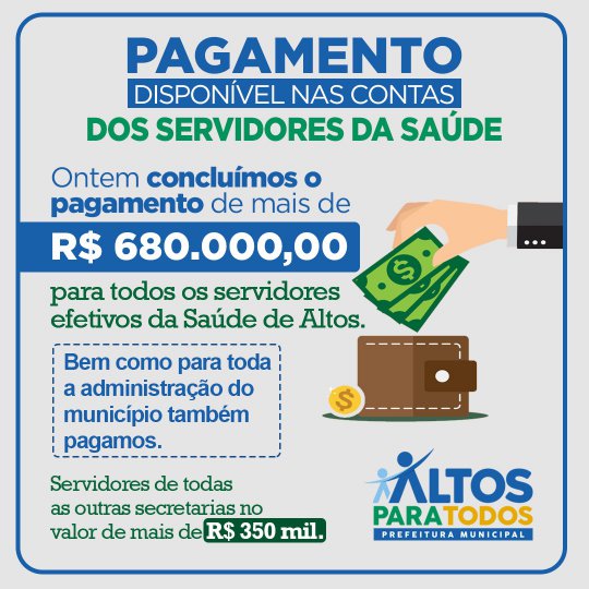 Nesta terça-feira (09) o prefeito da cidade de Altos, Maxwell da Mariinha concluiu o pagamento de mais de R$ 680 mil reais para todos os servidores efetivos da Saúde de Altos. Bem como para as outras administrações do município no valor de R$ 350 mil reais, somando um total de quase 1 milhão de reais somente para área da saúde.