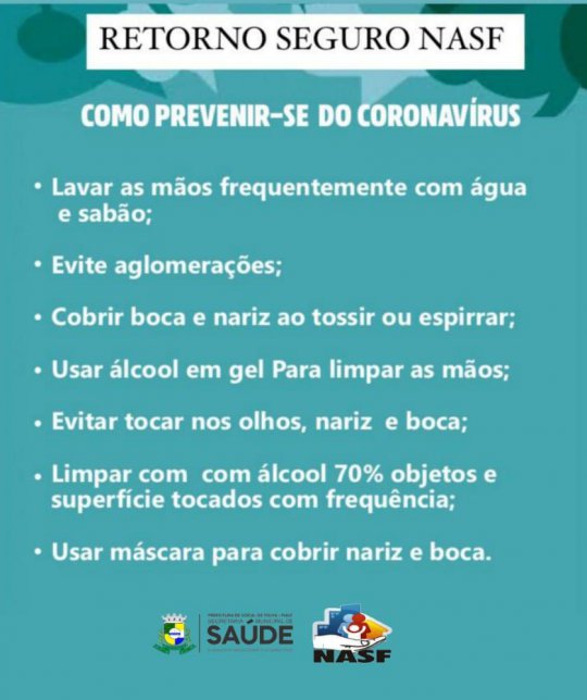 A equipe reforça as medidas de prevenção para um retorno das atividades de forma segura , como por exemplo, a lavagem das mãos com frequência com água e sabão, evitar aglomerações, usar álcool e o uso da máscara.