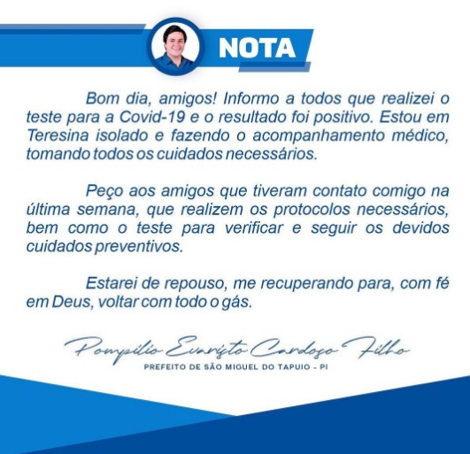 O prefeito infomou através de nota que segue isolado em Teresina para acompanhamento médico,com sintomas leves de dor na garganta e moleza no corpo. " Peço aos meus amigos que tiveram contato comigo na última semana, que realizem os prontocolos necessários, bem como o teste para verificar e seguir as medidas preventivas.Que Deus nos abençoe e nos proteja, Amém!", disse Pompilim.