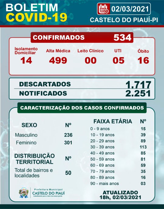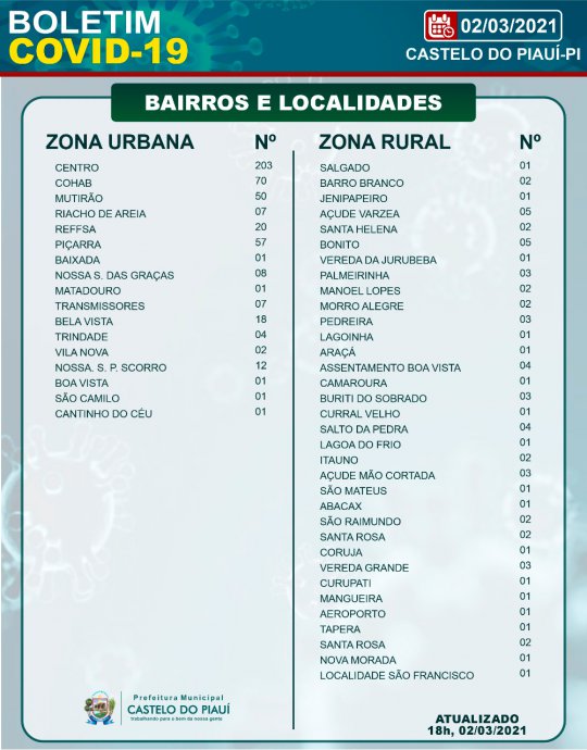 Castelo do Piauí nesta terça-feira (02) registrou 05 novos casos de infecção por coronavírus nas últimas 24 horas, desde a divulgação do ultimo boletim na noite de segunda-feira (01). O aumento dos números preocupam as autoridades de saúde sobre uma possível 2° onda de infecção.