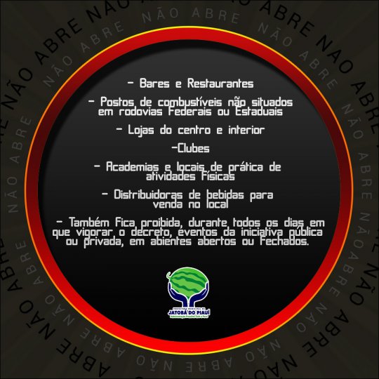 Os estabelecimentos em geral, poderão funcionar normalmente, respeitando o cumprimento dos protocolos do Estado do Piauí e da Vigilância Sanitária Municipal no que tange às medidas de combate e propagação à contaminação ocasionada pelo coronavírus, especialmente a utilização de máscaras de proteção facial, distanciamento obrigatório, higienização das mãos.