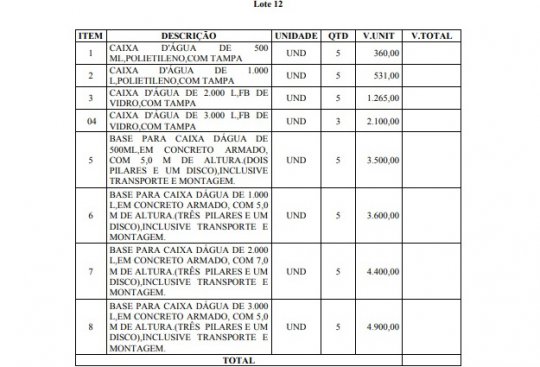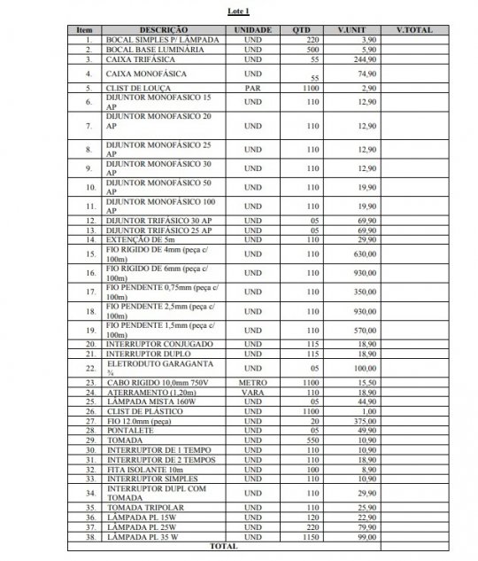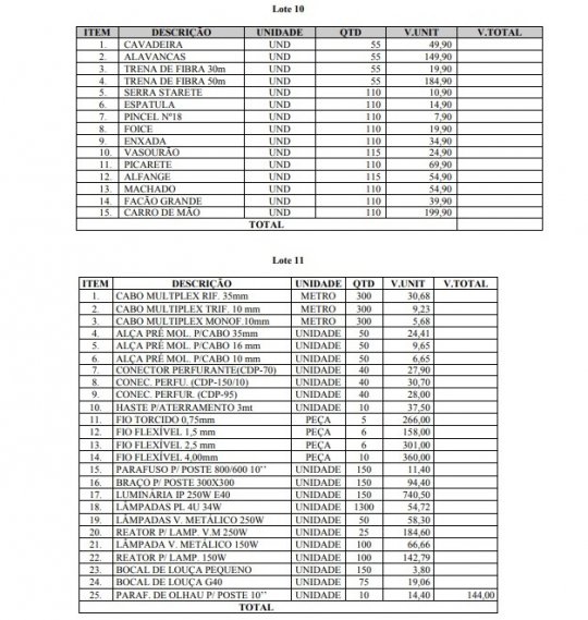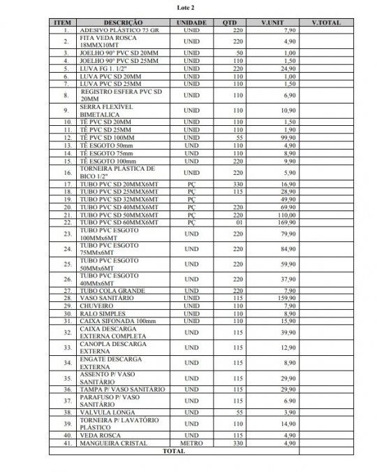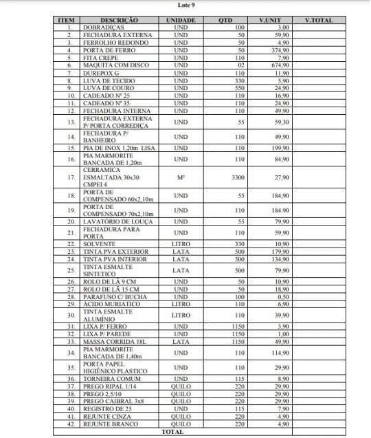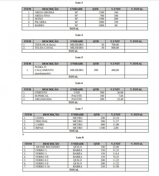 Serão 12 lotes de itens para construção (veja todos abaixo), como cimento, tijolos, telhas, madeira, e materiais elétrico e hidráulico. O valor previsto para gastos é de R$ 2.810.000,00 (dois milhões, oitocentos e dez mil reais).