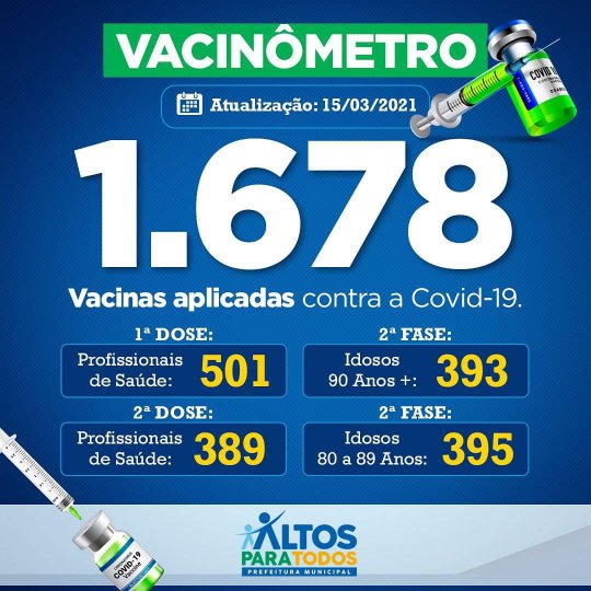 Segundo dados do painel epidemiológico do COVID-19 divulgado pela Secretaria Estadual de Saúde (Sesapi), Altos está entre os 15 dos 224 municípios piauienses com o melhor percentual de aplicação da 1ª dose da vacina contra o coronavírus. Cerca de 93% de aplicação foi ministrada em profissionais da saúde e idosos.