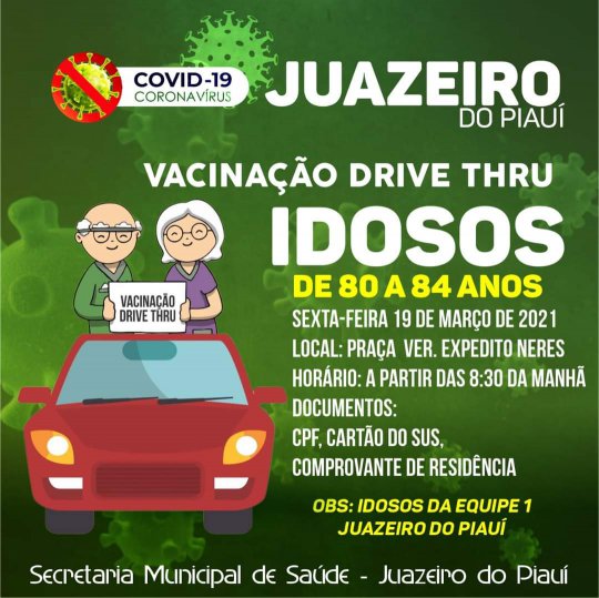 A Prefeitura Municipal de Juazeiro do Piauí, através da Secretaria Municipal de Saúde, realiza nessa sexta feira (19), a partir das 08h30, a vacinação de idosos entre 80 e 84 anos.