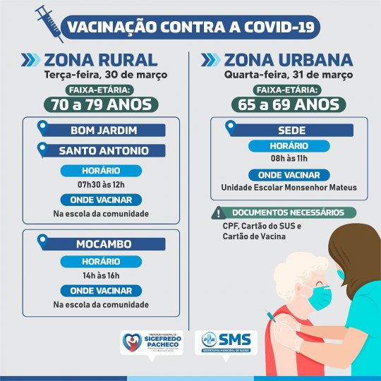 A prefeitura de Sigefredo Pacheco (PI), por meio da Secretaria Municipal de Saúde, realizará a vacinação de idosos de 70 a 79 anos da Zona Rural nesta terça-feira (30). As comunidades Bom Jardim e Santo Antônio começará a receber a vacinação na escola, a partir das 07:30h até as 12h. Já na parte da tarde, de 14h às 16h, a comunidade Mocambo receberá a vacinação na escola da comunidade.