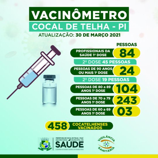 A prefeitura de Cocal de Telha (PI), por meio da Secretaria Municipal de Saúde, divulgou nesta terça-feira (30), o balanço com os dados da vacinação até o momento no município.