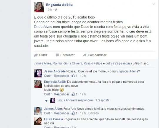 Foi sepultado na manhã desta sexta-feira o jovem Dadu Alves, conhecido por Dadinho. Ele morreu ontem, no último dia de 2015, vítima de um acidente de moto quando, segundo amigos, seguia para a cidade de Pedro II, pegar a namorada para a virada de ano na casa de seus pais.