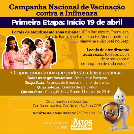 O município de Altos (PI) iniciou nesta segunda-feira (19) a distribuição da vacina da H1N1, contra o vírus da influenza (gripe). Neste primeiro momento estão elegíveis para receber a vacina as mulheres grávidas, as puérperas (mães que deram à luz há pouco tempo) além de crianças a partir de seis meses até as menores de seis anos de idade.