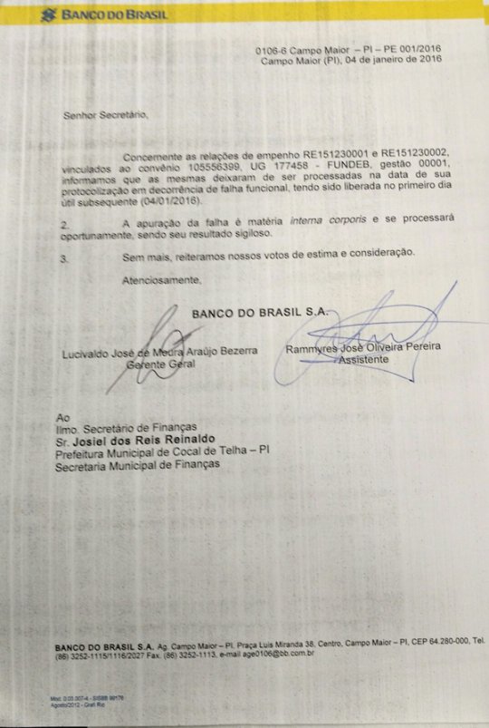 A gerência da Agência do Banco do Brasil de Campo Maior enviou ofício para a Secretaria Municipal de Finanças de Cocal de Telha informando o ocorrido e que medidas administrativas serão tomadas para apurar o fato.
