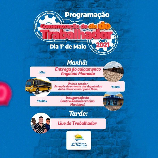 Neste sábado (1° de maio) será realizado a 'Super Live do Trabalhador', em comemoração ao dia do trabalho. Além da live que será transmitida pelas redes sociais da prefeitura de Nossa Senhora de Nazaré com atrações musicais, o evento terá uma vasta programação.