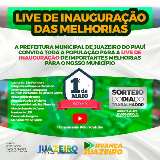 A Prefeitura Municipal do município de Juazeiro do Piauí, divulgou na manhã desta sexta-feira (30), um convite para uma live em que serão inauguradas obras estruturais e de atendimentos anteriormente não realizados.