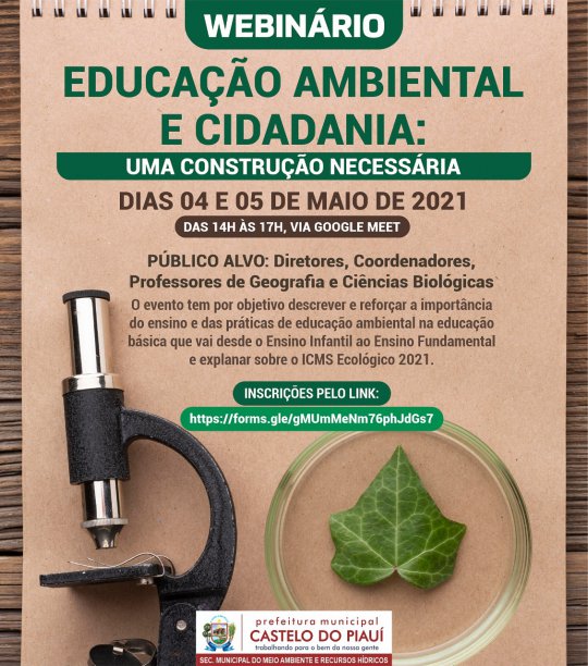Por meio da Secretaria de Meio Ambiente, a Prefeitura de Castelo do Piauí vai realizar o 1°Webinário Educação Ambiental e Cidadania: uma construção necessária.