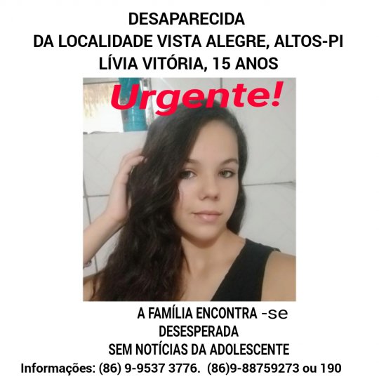Uma jovem identificada como Lívia Vitória, 15 anos, está desaparecida deste a madrugada do domingo (16) para segunda (17), da localidade Vista Alegre, situada entre as cidades de Altos e Teresina (PI).