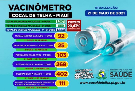 A Prefeitura de Cocal de Telha (PI) através da Secretaria de saúde, divulgou nesta sexta-feira (21) o 'Vacinômetro' com o balanço do total de doses da vacina contra Covid-19 aplicadas na populção do município.