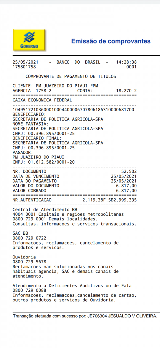 A equipe da Secretaria de Agricultura Juazeirense disponibilizou, ao EmFoco, o comprovante de pagamento a Caixa, da primeira parcela, no valor de R$ 6.817,00.