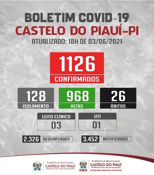 A pandemia em Castelo do Piauí já reúne 1126 pessoas que contraíram o vírus, destes sendo 968 já recuperados, 128 que permancem em isolamento domiciliar, 03 em leitos clínicos e 01 em leito de UTI.