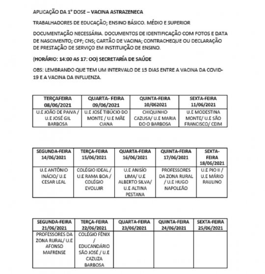 A vacina começará às 14 horas obedecendo a escala de duas escolas por tarde. Os professores que foram vacinados contra a influenza serão orientados por uma escala a partir da próxima segunda-feira (14) para receber a 1ª dose contra a COVID-19.