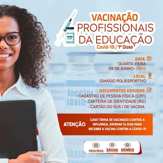 A vacinação começará às 08 horas no ginásio poliesportivo. professor, coordenador, vigia, diretor, zelador e todos os demais profissionais da educação, não esqueçam de levar os documentos pessoais: CPF, RG e as carteirinhas do SUS e de vacina.