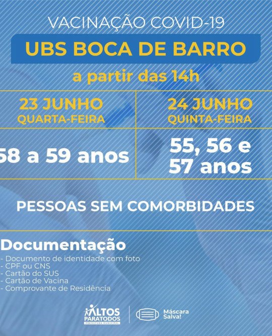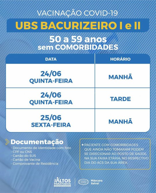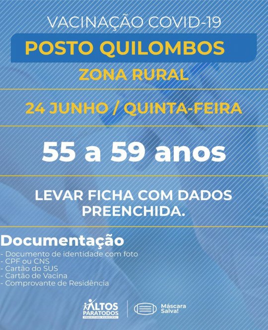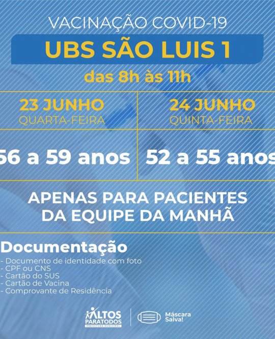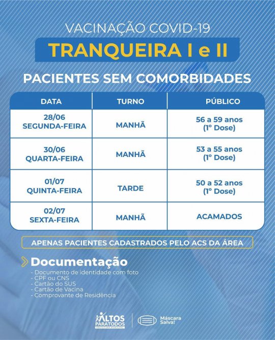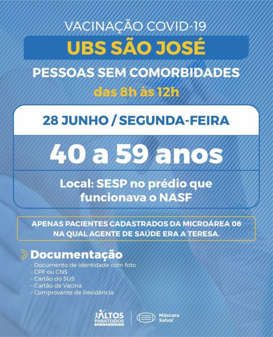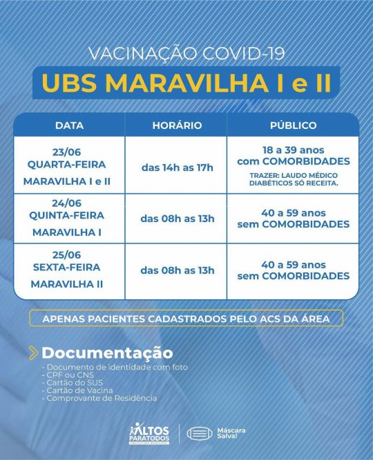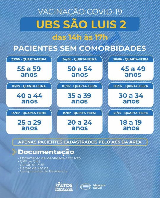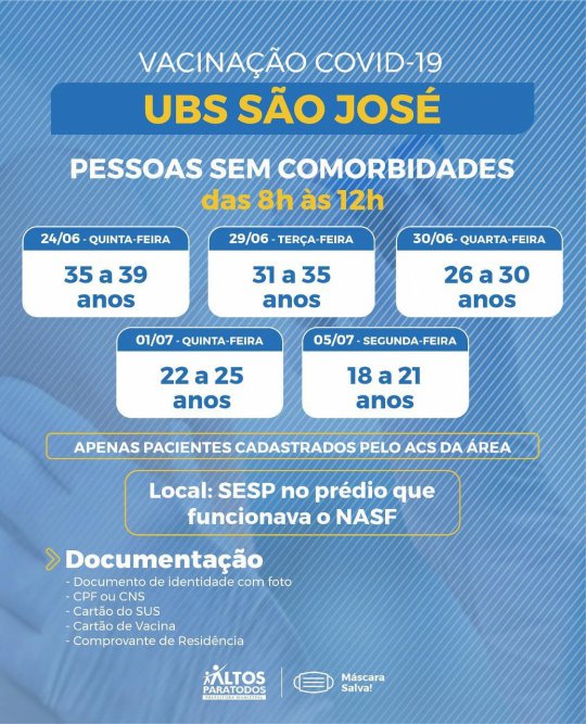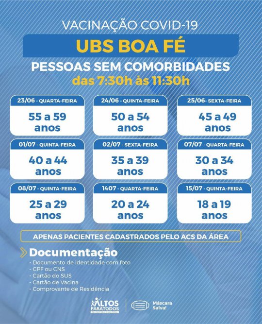 A Prefeitura Municipal de Altos (PI) divulgou na noite desta quarta-feira (23) o cronograma completo de vacinação contra Covid-19 nas Unidades Básicas de Saúde (UBS), no município. A organização das faixas etárias e locais foi realizado por meio dos cadastramentos feitos pelos agentes de saúde de cada bairro e localidades da cidade.