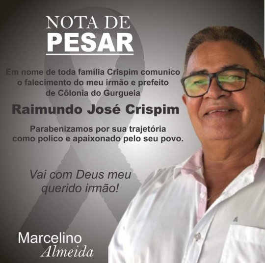 "É com imenso pesar, que a Câmara Municipal de Coivaras, por meio do presidente, Antônio Fábio de Sousa Oliveira, (Graxeta do Povo) – PL e todos os parlamentares da casa legislativa, lamenta a morte do prefeito Raimundo José Crispim do MDB da cidade de Colônia do Gurgueia, na tarde desta quinta-feira dia, 24 de junho de 2021, vítima de problemas cardíaco.