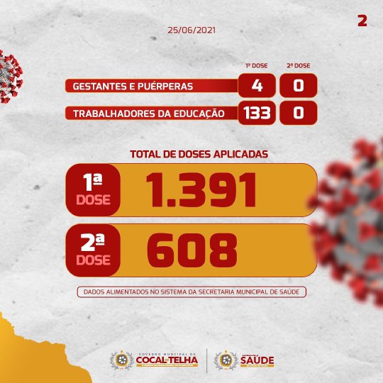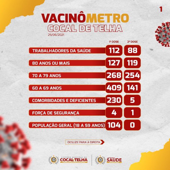 A prefeitura de Cocal de Telha (PI) através da Secretária de Saúde, divulgou neste sábado (26) o balanço do andamento das vacinações contra Covid-19 no município, por meio do 'Vacinômetro'.