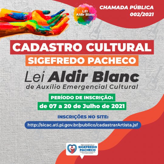 O município de Sigefredo Pacheco PI, por meio da Prefeitura Municipal, tornou público através do diário oficial e mídias sociais a criação e regulamentação do Edital para Projetos Culturais de Sigefredo Pacheco com benefícios provenientes da Lei Aldir Blanc - Lei Federal n° 14.017/20, referente a criação da LEI DE AUXILIO EMERGENCIAL CULTURAL, que tem por finalidade selecionar e contratar propostas artísticas e culturais nas mais diversas linguagens para exibição em plataformas digitais acordo com a Lei.