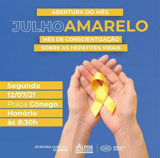 A Prefeitura de Altos através da Secretaria Municipal de Saúde lança a campanha Julho Amarelo de conscientização sobre doenças hepáticas virais. O dia D ocorrerá na próxima segunda-feira (12), na praça Cônego Honório da igreja matriz de São José, no centro da cidade. O evento está programado para iniciar às 8:30 da manhã.