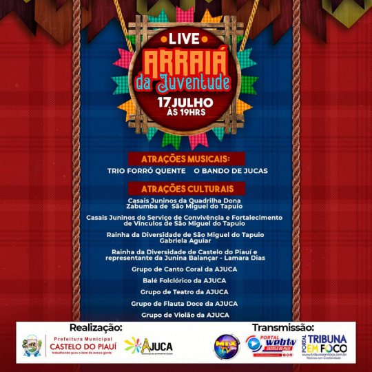 A Prefeitura de Castelo do Piauí em parceria com a AJUCA, realizará neste sábado (17) a live Arraiá da Juventude com várias atrações culturais e musicais.