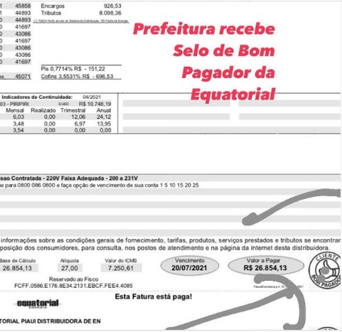 O prefeito Tim Medeiros informou nesta quarta-feira (14), que o município de Capitão de Campos (PI) recebeu o selo de "Bom Pagador' da Equatorial Energia. Segundo o comprovante publicado pelo prefeito, foi pga neste mês de julho o valor de R$ 26.854,13 reais de conta de luz.