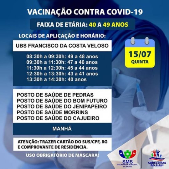 Nesta quinta-feira (15) será iniciada a vacinação das pessoas com faixa etária entre 40 e 49 anos contra a covid-19, em Cabeceiras do Piauí.