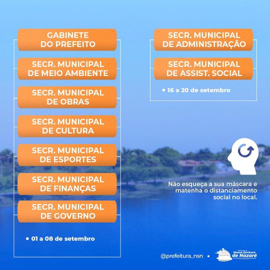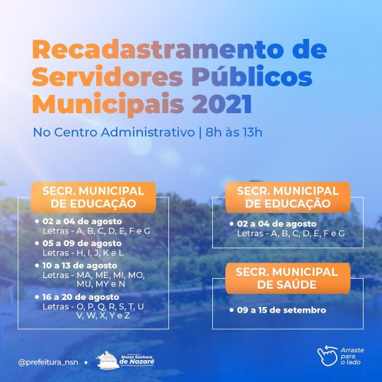 A Prefeitura Municipal de Nossa Senhora de Nazaré, por meio da secretaria de Administração, convoca a todos os servidores públicos municipais efetivos para a realização do recadastramento nas datas de 02 a 20 de agosto e de 1° a 20 de setembro deste ano.