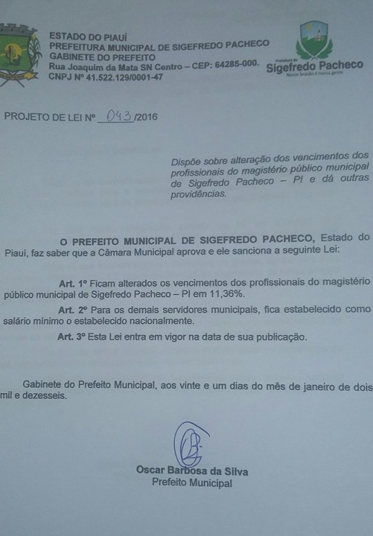 O prefeito de Sigefredo Pacheco Oscar Bandeira, e o secretário municipal de educação Murilo Bandeira já enviaram para a câmara de vereadores o Projeto de Lei do novo piso dos professores, que teve um aumento de 11,36%.