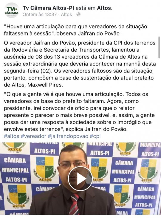 Recentemente, surgiu uma suspeita em torno da presidente da Câmara de Altos (PI), Regina Catarina, onde estaria utilizando o site e a rede social “TV Câmara Altos” para divulgar apenas informações sobre sua base de oposição em favor da ex-prefeita Patrícia Leal e o grupo político.