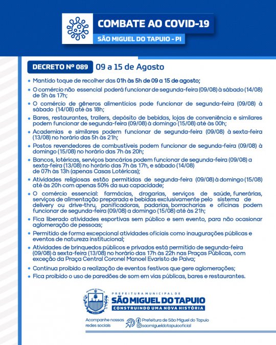 Nesta segunda-feira (09) a prefeitura de São Miguel do Tapuio informou que continuará seguindo as regras impostas pelo Decreto em combate ao novo Coronavírus na região. As medidas valerão a partir desta segunda-feira (09) até a domingo (15). Será mantido o toque de recolher das 01h às 5h de 09 a 15 de agosto; Confira as demais restrições: