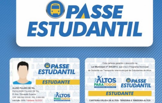 A partir da próxima segunda-feira (16), a Prefeitura Municipal de Altos inicia o processo de emissão do passe estudantil com o cadastro em plataforma digital pelo site altos.pi.gov.br proporcionando desconto nas passagens de Altos à Teresina.