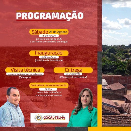 A programação inicia neste sábado (21) de agosto a partir das 16hrs em frente ao comércio do Braga, com a inauguração de duas ruas, a da UBS e a do bairro Barra Nova. Logo após a prefeita e o Deputado seguirá para uma visita técnica nas ruas com pavimentações em andamento na comunidade Calengue.