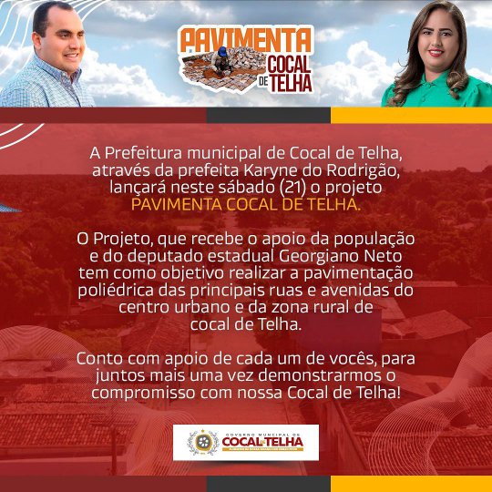 A Prefeita de Cocal de Telha (PI), Karyne do Rodrigão convida toda a população para o lançamento do projeto 'PAVIMENTA COCAL DE TELHA', um dos maiores projetos de pavimentação poliédrica de toda região dos Carnaubais.