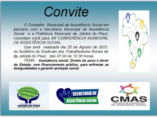 O Conselho Municipal de Assistência Social em parceria com a Secretaria Municipal de Assistência Social e a Prefeitura Municipal de Jatobá do Piauí, convida todos para XII Conferência Municipal de Assistência Social.