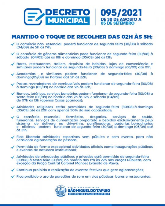 As Atividades religiosas estão permitidas de segunda-feira (30/08) à domingo (05/09), mas só até às 20h e com apenas 50% da sua capacidade. O comércio essencial: farmácias, drogarias, serviços de saúde, funerárias, serviços de alimentação preparada e bebidas exclusivamente pelo sistema de delivery ou drive-thru, panificadoras, padarias, borracharias e oficinas podem funcionar de segunda-feira (30/08) à domingo (05/09) até às 21h.